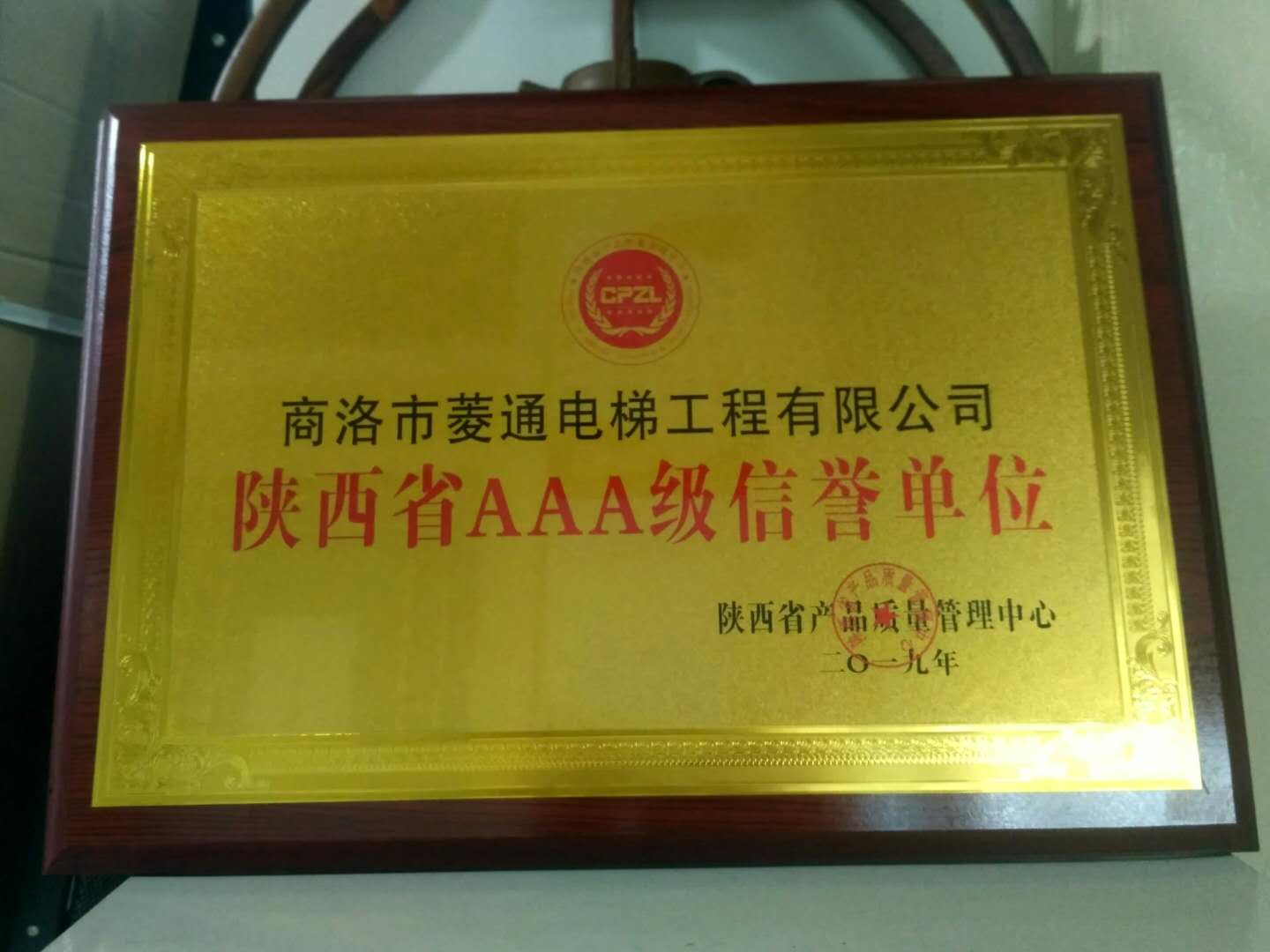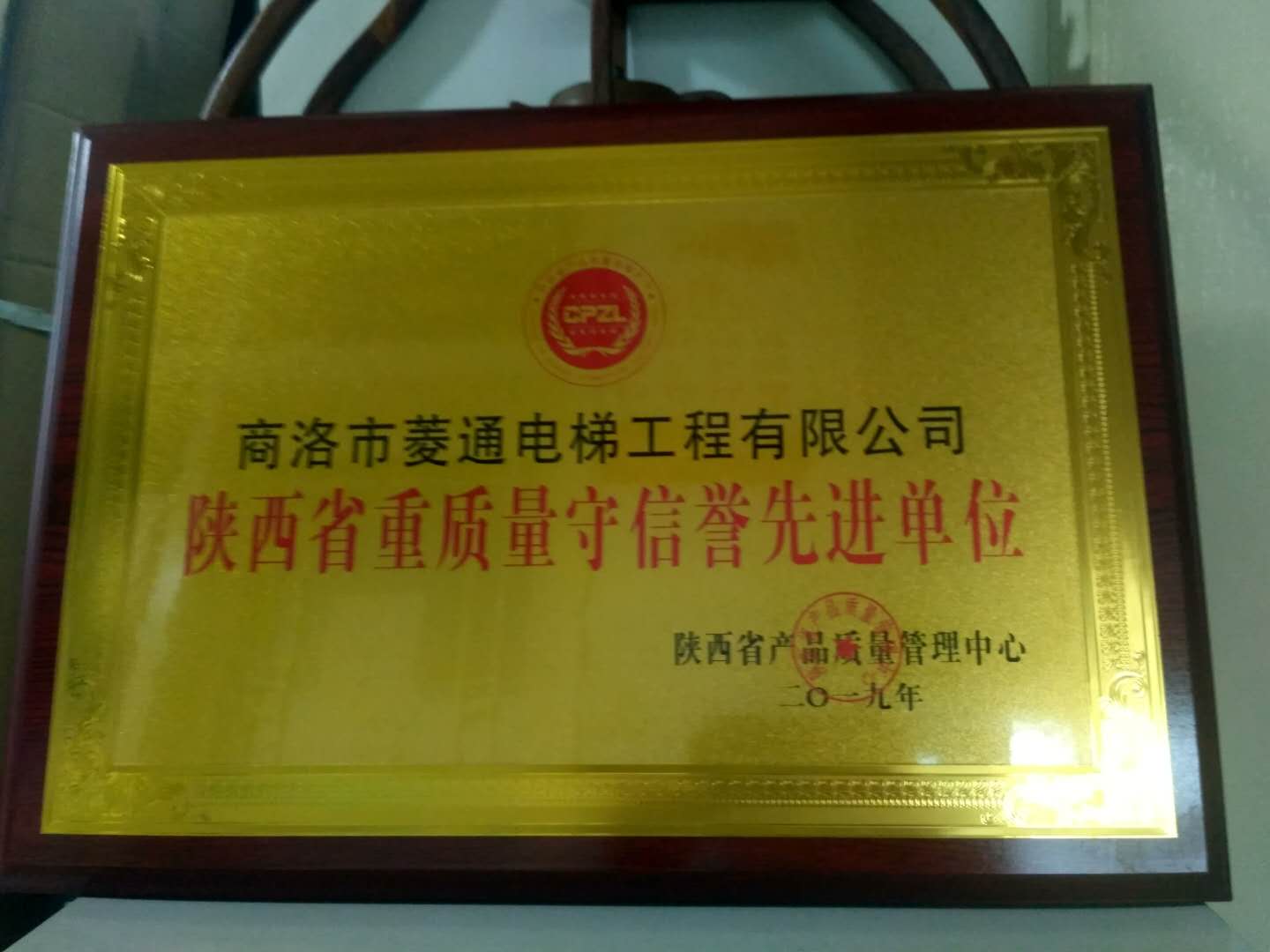 商洛菱通電梯工程有限公司,2019年很榮幸被陜西省產(chǎn)品質(zhì)量管理中心評(píng)為:陜西省AAA級(jí)信譽(yù)單位和陜西省重質(zhì)量守信譽(yù)先進(jìn)單位;并頒發(fā)獎(jiǎng)牌及榮譽(yù)證書。這個(gè)榮譽(yù)不但得益于各單位的支持與默契合作,更得益于我公司優(yōu)良的團(tuán)隊(duì)氛圍和集體上下一致積極認(rèn)真的工作態(tài)度。更得益于領(lǐng)導(dǎo)重承諾守信譽(yù):提倡安全第一,質(zhì)量第一,信譽(yù)第一的原則。能被評(píng)為3A級(jí)信譽(yù)單位和信譽(yù)先進(jìn)單位,既是對(duì)公司工作的肯定,也是對(duì)今后工作做得更好的一種鼓勵(lì),我公司定會(huì)盡職盡責(zé)做得更好。